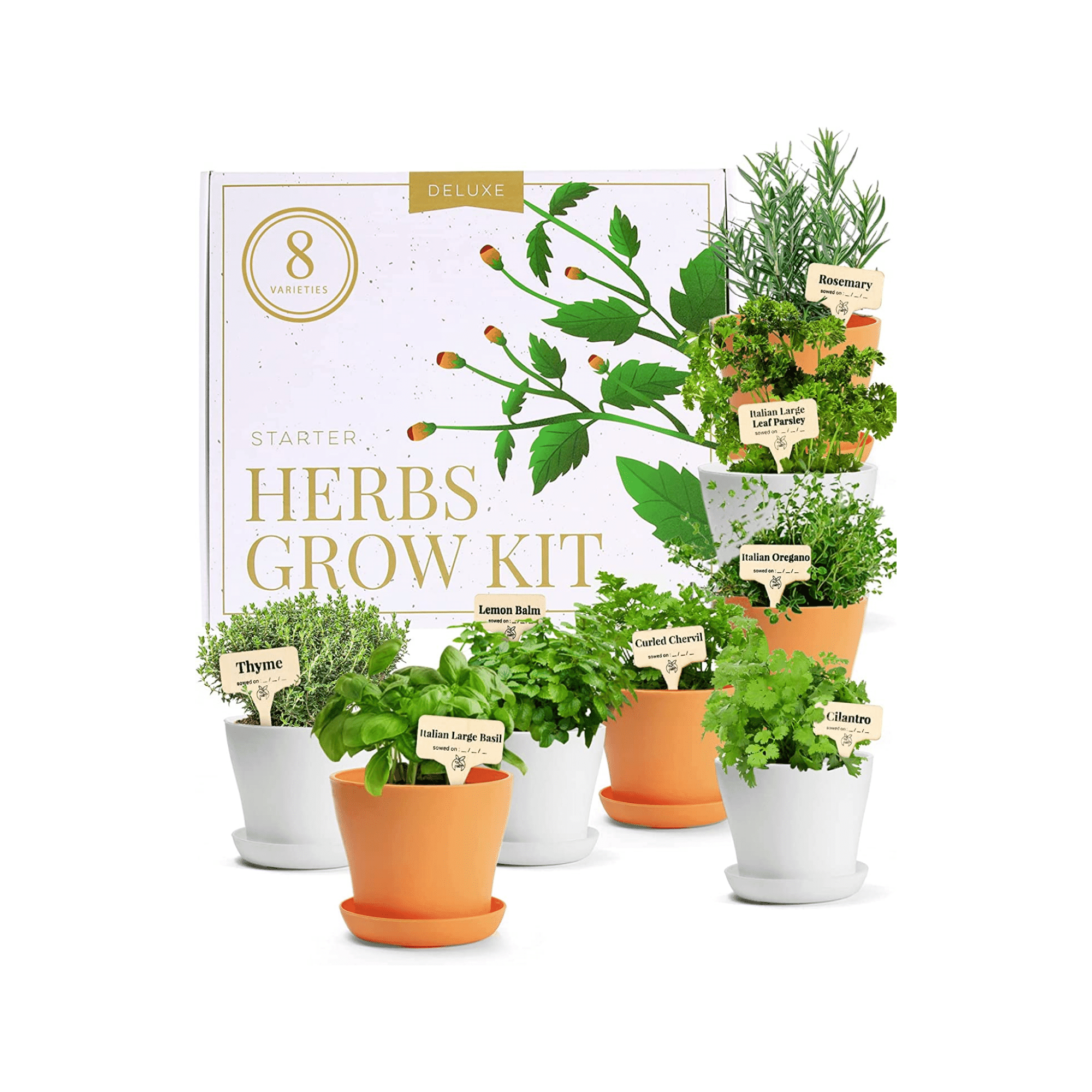 indoor herb garden, with 8 different types of USA-sourced seeds. Just place the pots on a sunny windowsill or shelf, and soon you'll have a mini-garden of oregano, thyme, lemon balm, parsley, basil, curled chervil, cilantro, and rosemary. Plus, the included grow guide provides all the expert guidance you need to ensure your plants thrive.